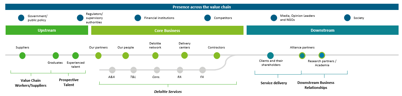 Strategy, business model and value chain (ESRS 2 SBM-1): Our businesses and industries, About Deloitte, Our purpose and strategy, Our progress, Value creation;